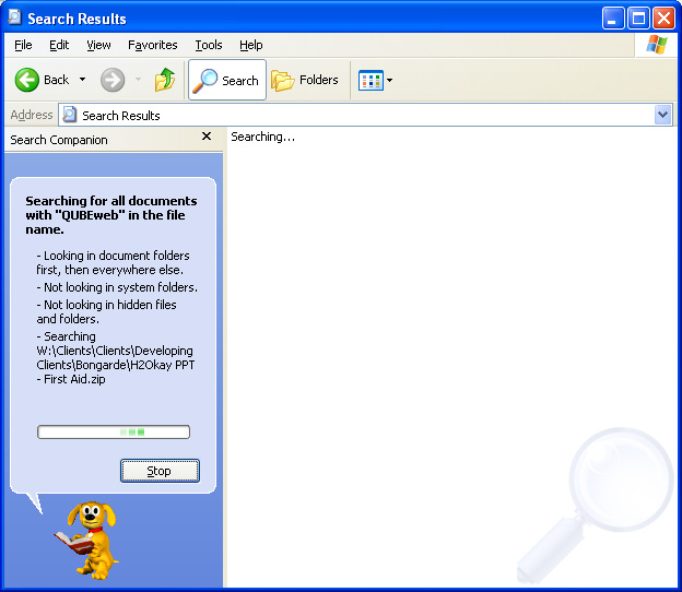 In my new job I am using a Microsoft Windows PC for the first time to any significant degree.  While searching for a file in "My Documents" (the "Finder" in Mac-speak), as the computer scans its filenames for the string I entered, a small animation of a dog leafing through the pages of a book appears.  After it did not finding anything during 35 minutes (!!!??) of scanning my drive--but it was still looking--I canceled the search.  Turns out that a dog looking through a book is the perfect image for such a useless and slow search utility.